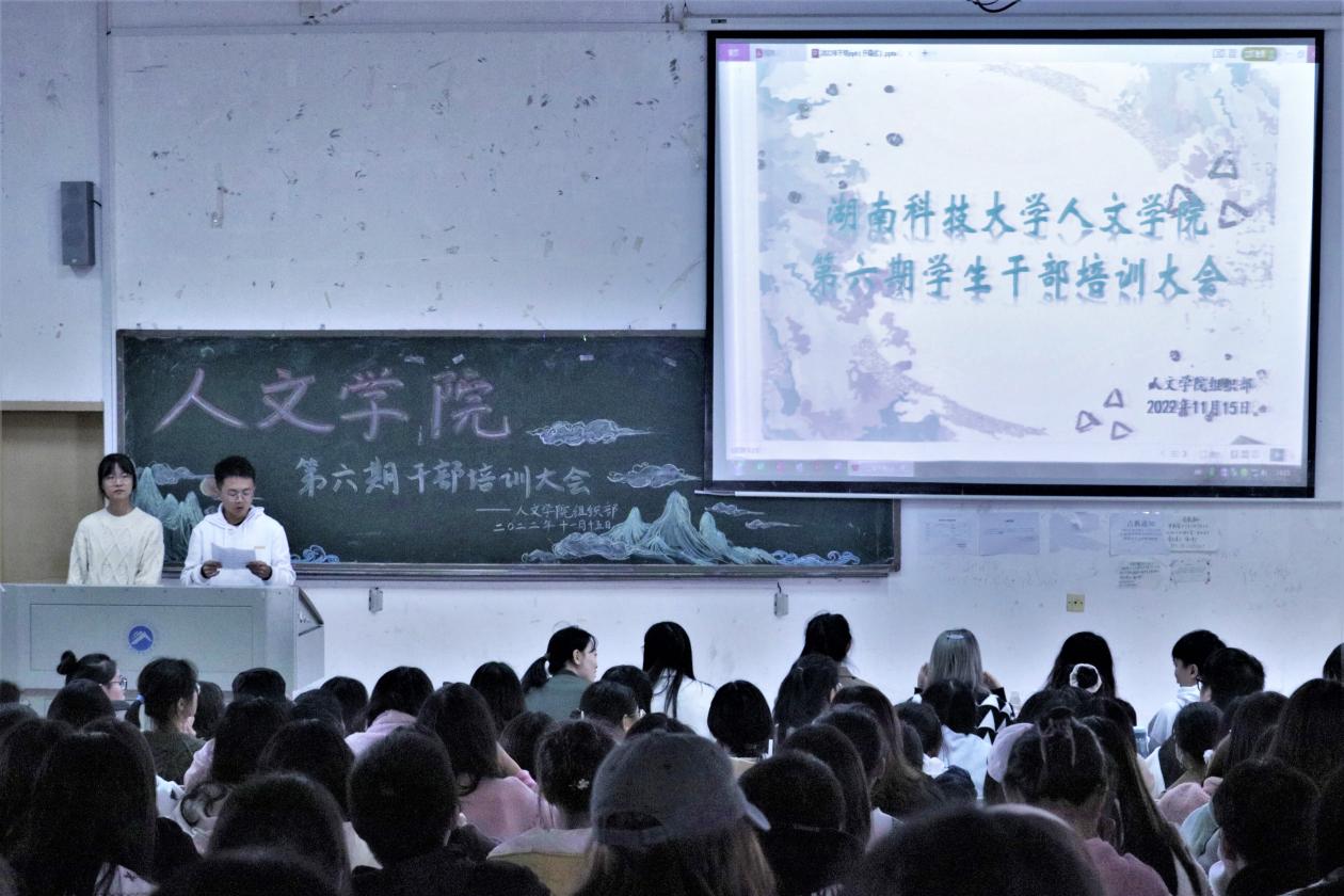 为提高学生干部的专业性、纪律性,提高学生干部素质的同时加强组织部门间的交流联系,人文学院于11月15日下午两点在第五教学楼2-3教室召开第六期学生干部培训大会。人文学院副教授张学知、21级辅导员杨燕、22级辅导员赵文静、团委学生会主席团以及全体22级学生会干部参加此次大会。